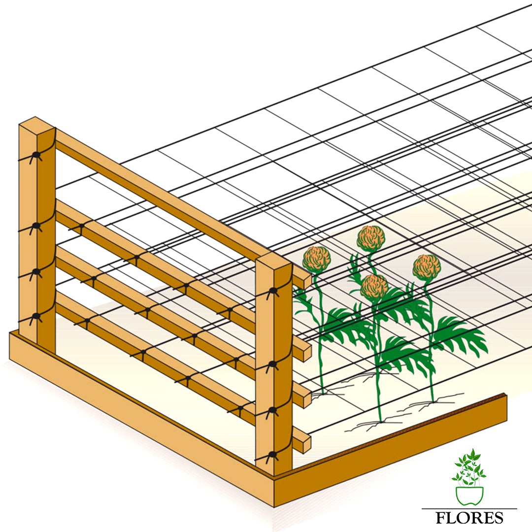 Augstas kvalitātes profesionālais polipropilēna siets, kas ir mainījis griezto ziedu audzēšanas sistēmu. Tas ir aizstājis metāla sietus, dzelzs režģus un ātri bojājošos materiālus, piemēram, bambusa niedres vai koku, ko tradicionāli izmanto atbalsta un atdalīšanas rāmju izveidošanai.